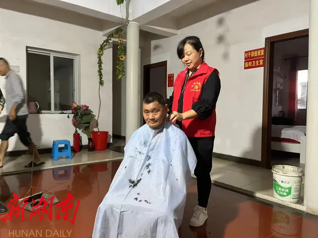 6月29日晚,军山铺镇太常山村志愿者田红为转移安置群众理发。(通讯员:李园)