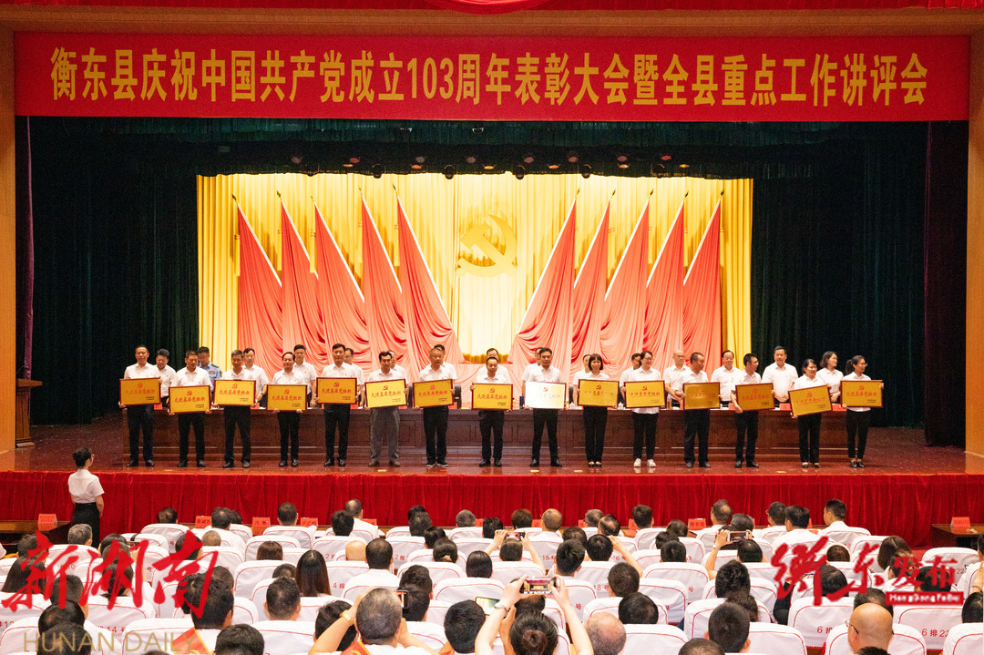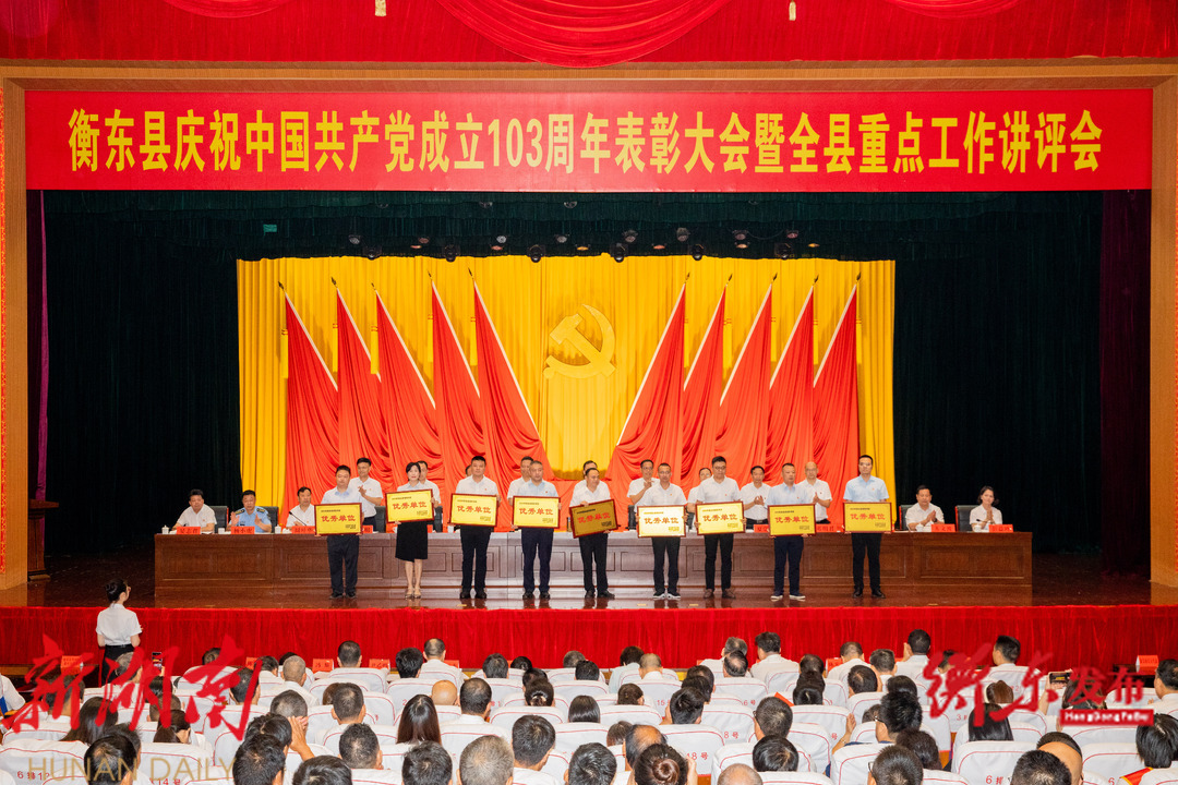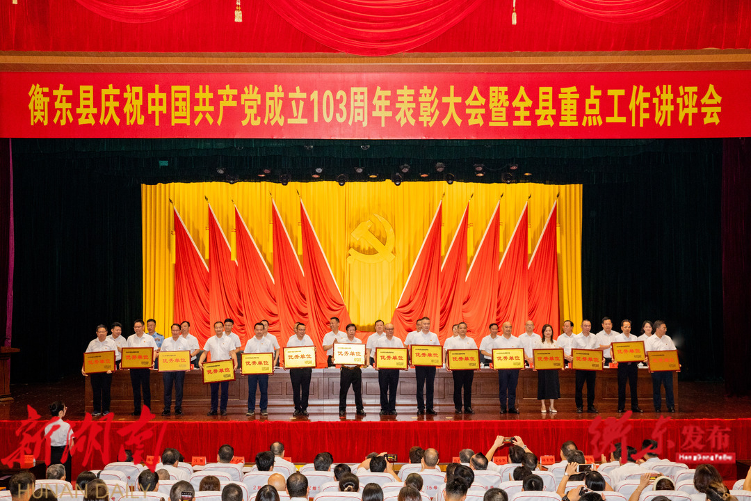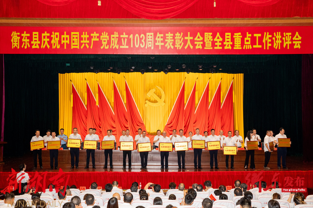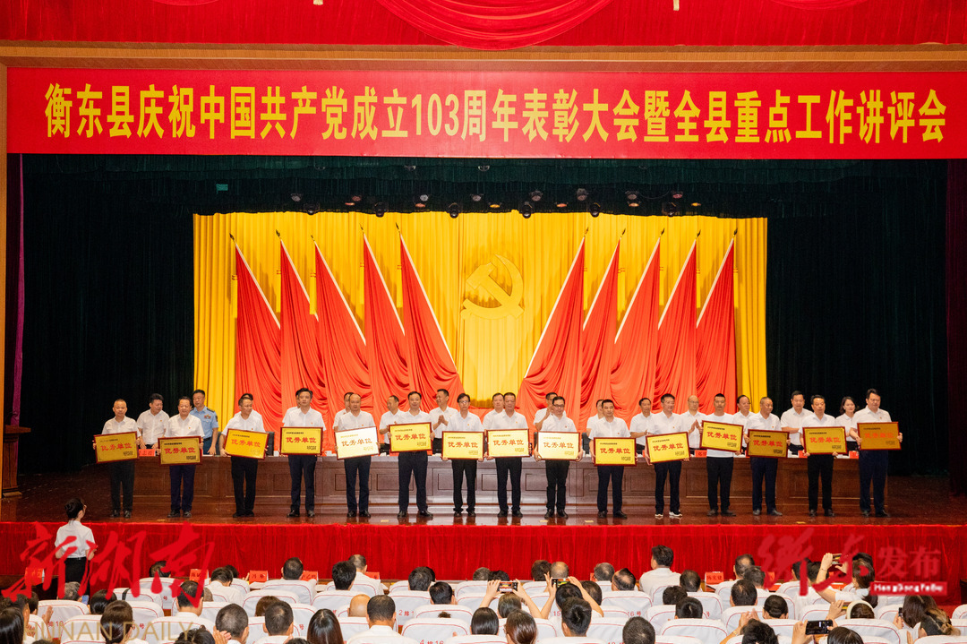 7月1日上午,衡东县庆祝中国共产党成立103周年表彰大会暨全县重点工作讲评会在武家山政府会务中心召开。会议 宣读了《中共衡东县委关于表彰2024年优秀共产党员、优秀党务工作者和先进基层党组织的决定》,通报了2023年度绩效考核优秀单位名单和领导班子考核优秀单位名单;会议为受到县委表彰的先进基层党组织、绩效考核优秀单位、优秀领导班子分别进行了现场颁奖。