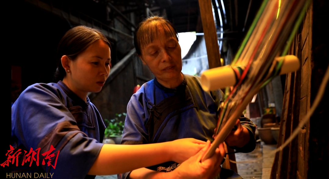 女书传承人胡美月说道:“ 我在做女红的时候胡欣就在旁边看着,她就问:姐姐,这是什么?我说这是女红,我们女性还有这种民族文化的一种女工,她就一看就会了。”