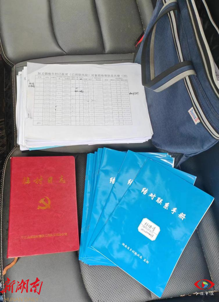 驾驶室内,悬挂的工作证格外显眼。后座上,放着他工作的手提布包,包内则是他驻村结对帮扶工作文件、结对联系手册、驻村日志。
