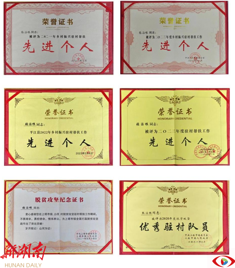 在平江担任驻村干部7年来,张滔根扎根乡村,在平凡的基层默默奉献、担当作为,多次被评为“乡村振兴驻村帮扶工作先进个人”,受到表彰。