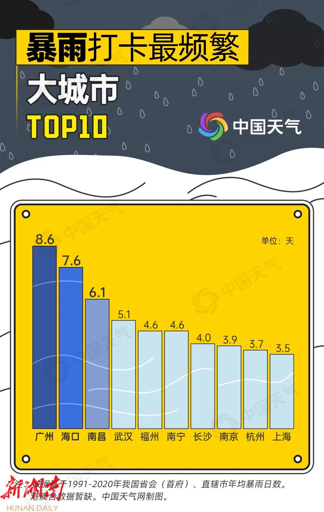从暴雨打卡最频繁的大城市来看,广州的年均暴雨日数最多,高达8.6天,海口、南昌分别以7.6天和6.1天位列二三名,武汉、福州、南宁、长沙、南京、杭州、上海也上榜,年均暴雨日数超过3天。