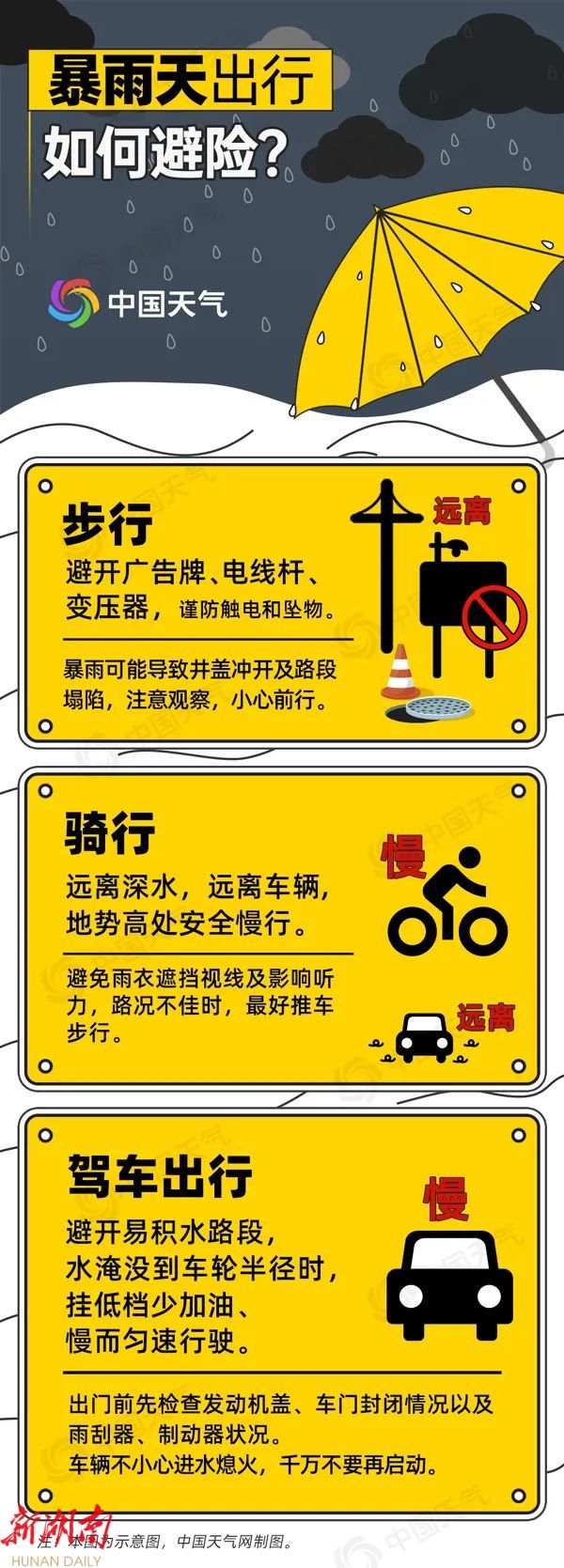 如果驾车出行,出门前先检查发动机盖、车门封闭情况以及雨刮器、制动器状况;避开易积水路段,水淹没高度到车轮半径时,应挂低档少加油、慢而匀速行驶;如果车辆不小心进水熄火,千万不要再启动。