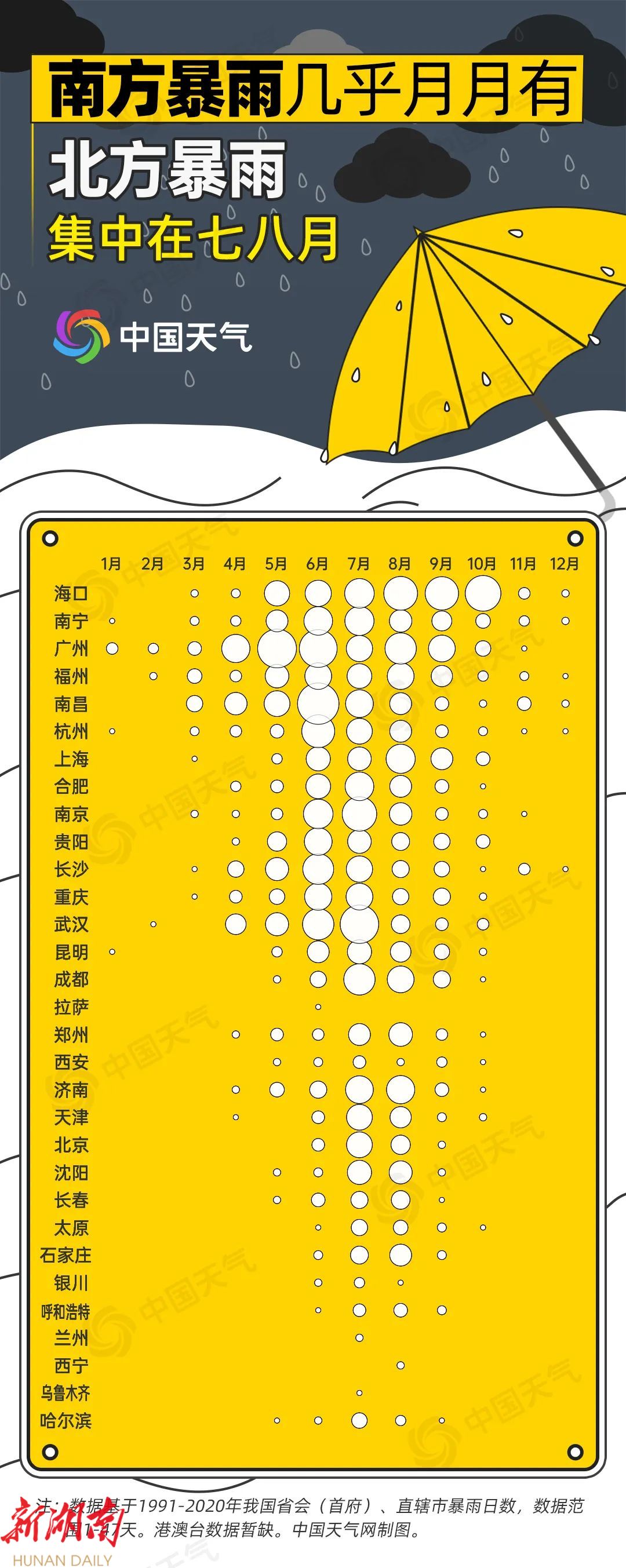 在我国,暴雨多出现在4月至9月,但各地高发期不一。相对来说,南方地区雨季战线长,一年四季都有出现暴雨的可能性,珠江流域和长江流域5月至8月为暴雨多发期,有些城市如广州暴雨几乎每个月都有。而北方地区雨季短,暴雨多出现在7月至8月,其他月份概率较小。