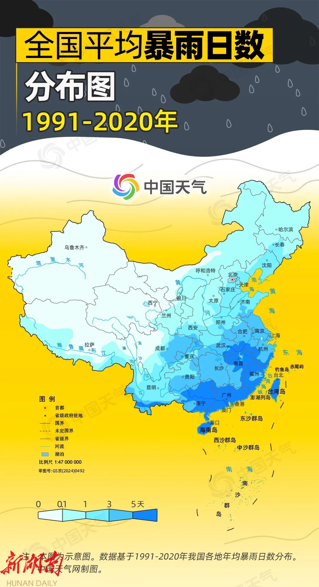 从常年来看,江南、华南等地是我国强降雨多发地。中国天气网统计常年暴雨日数分布情况发现,我国暴雨最多发区域集中在广东、广西、福建、江西、海南、台湾以及湖北东南部、云南南部等地,年均暴雨日数在5天以上,江苏、浙江、安徽、湖南、重庆以及贵州中南部、湖北东部和南部、四川东部等地年均暴雨日数在3至5天,为次多地区。