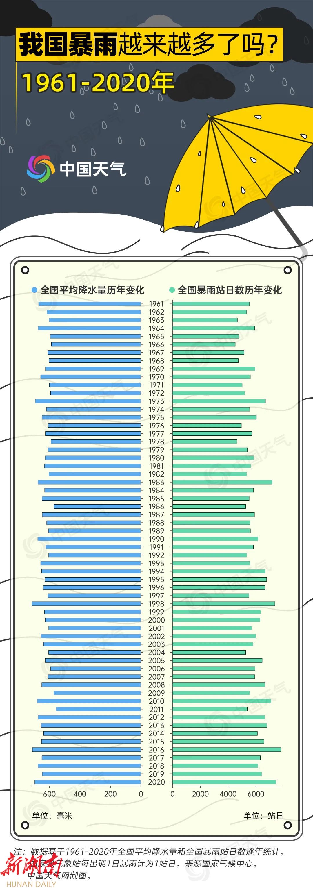“桂林暴雨变威尼斯”、“长沙暴雨1小时下了54个西湖”、“杭州灵隐寺发大水”……今年6月进入主汛期以来,南方地区的暴雨过程一轮接一轮,多地降水量突破历史同期极值,暴雨相关话题频登热搜。今年南方强降雨有多猛?暴雨如此频繁是否罕见?影响我国的暴雨是否越来越多?中国天气网盘点气象大数据,揭秘我国暴雨60年之变。