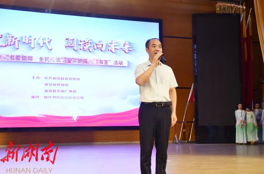 活动首先播放了总宣传片《阅读让新邵更美好》,展示了阅读给新邵带来的积极变化和深远影响。谢小军宣布“书香新邵·全民阅读”暨“护苗·绿书签”活动正式启动,标志着新邵全民阅读和“护苗·绿书签”行动踏上了新的征程。