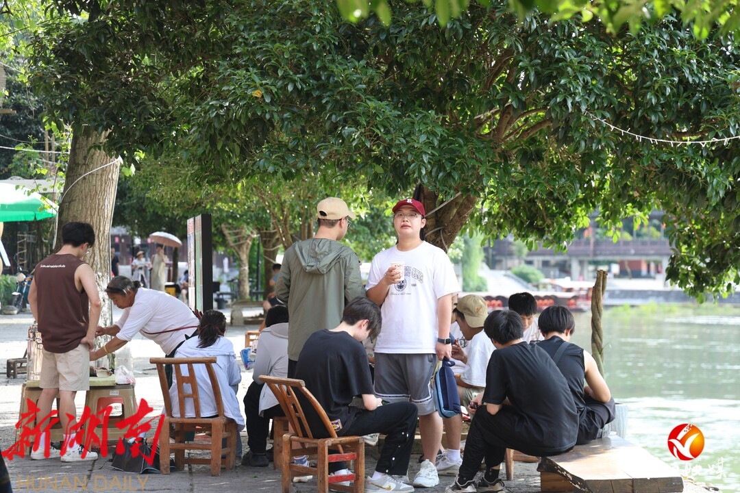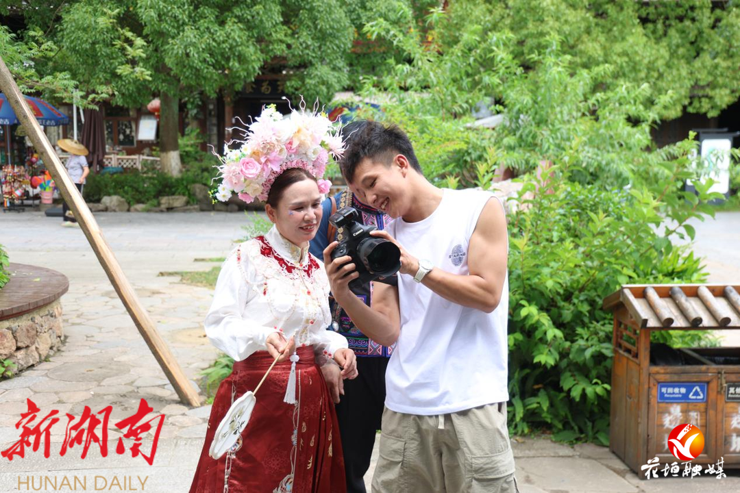 7月4日下午,记者在边城茶峒景区看到,不少游客行走在清水江边,欣赏古镇风光。部分游客画着精致的妆容,换上独具特色的民族服饰,在景区内拍照打卡。