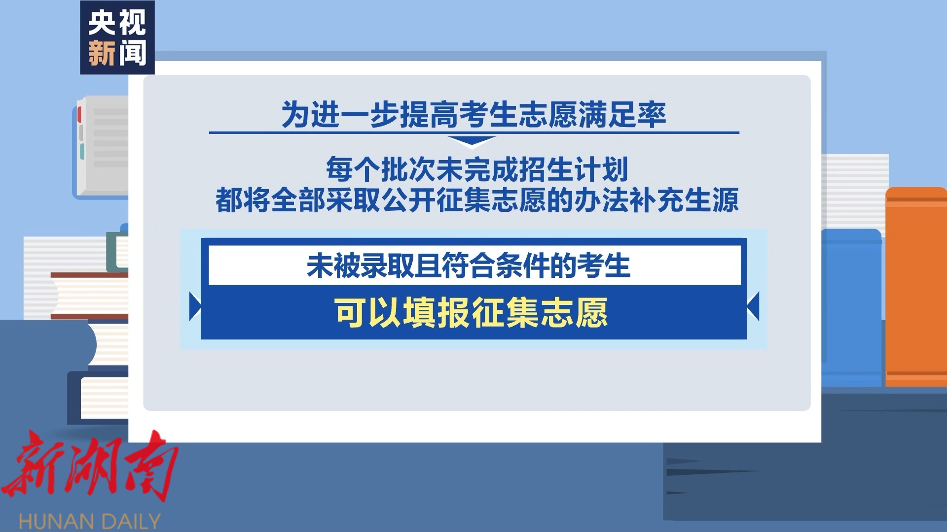为进一步提高考生志愿满足率,每个批次未完成招生计划都将全部采取公开征集志愿的办法补充生源,未被录取且符合条件的考生可以填报征集志愿。各批次征集志愿填报、录取在下一批次录取开始前进行。