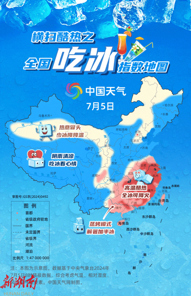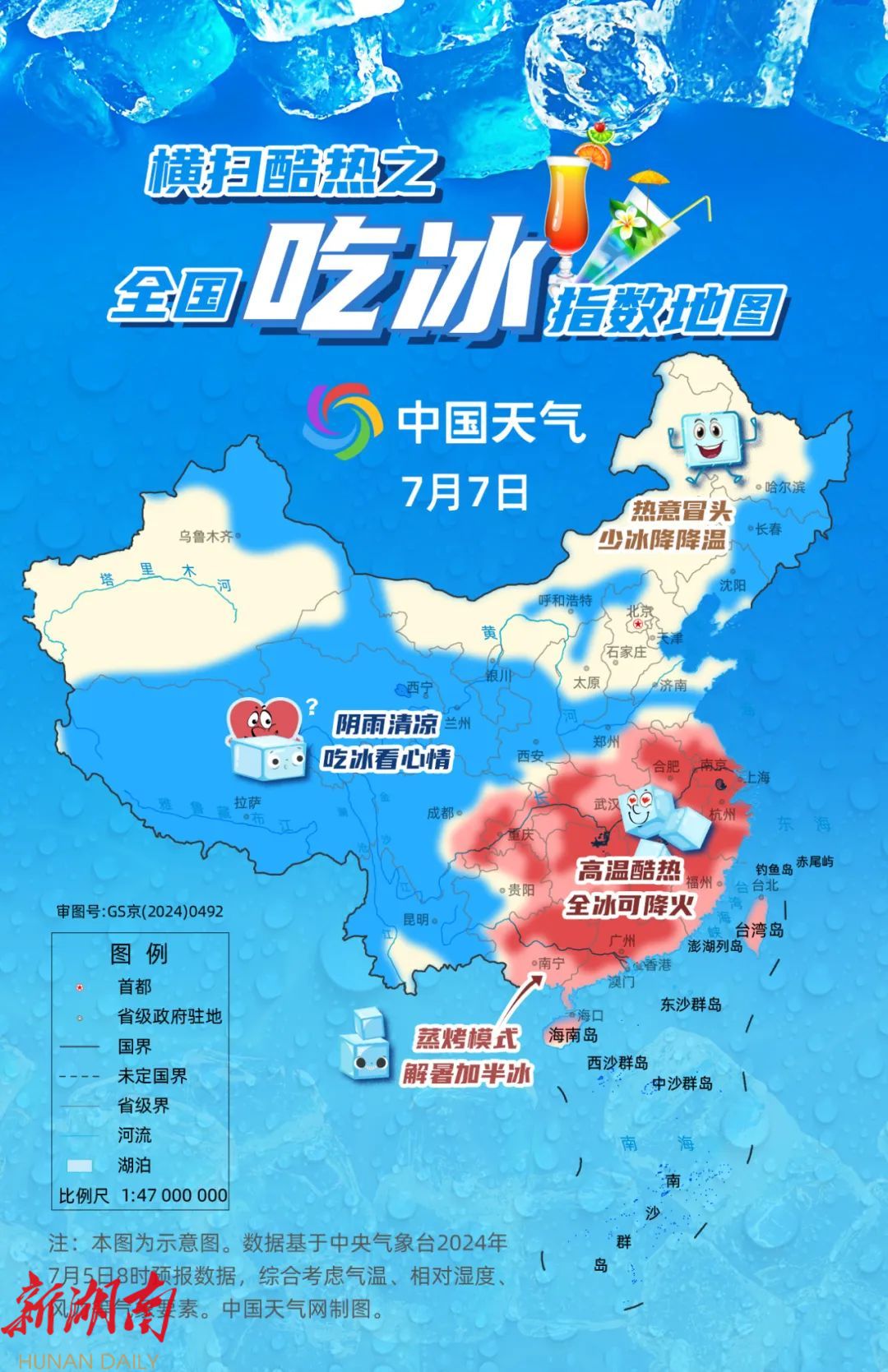 眼下,我国南方地区正在经历持久的高温桑拿天。今起三天(7月5日至7日),高温将盘踞在江淮、江南、华南等地,影响范围逐渐扩大,上海、安徽、浙江、江西、福建等不少地方体感温度可达40℃以上,出门仿佛进蒸笼,急需冰爽美食消暑。中国天气网特别奉上全国吃冰指数地图,看你家横扫酷热需要全冰、半冰还是少冰。