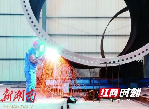 衡山恒岳重钢生产车间,技术人员正在焊接风力发电机组塔筒。周围 摄