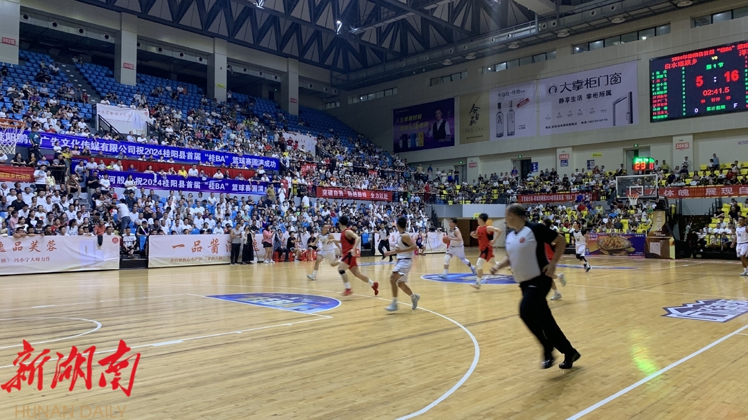 新桂阳7月7日讯(记者 曹诗灏)7月5日晚,2024年桂阳县首届“桂BA”篮球赛在县全民健身中心开幕,本次比赛由县总工会、县文旅广体局主办,县全民健身服务中心、县篮球协会承办,参赛队伍为22支乡镇(街道)代表队,共计330名运动员、教练员参赛。