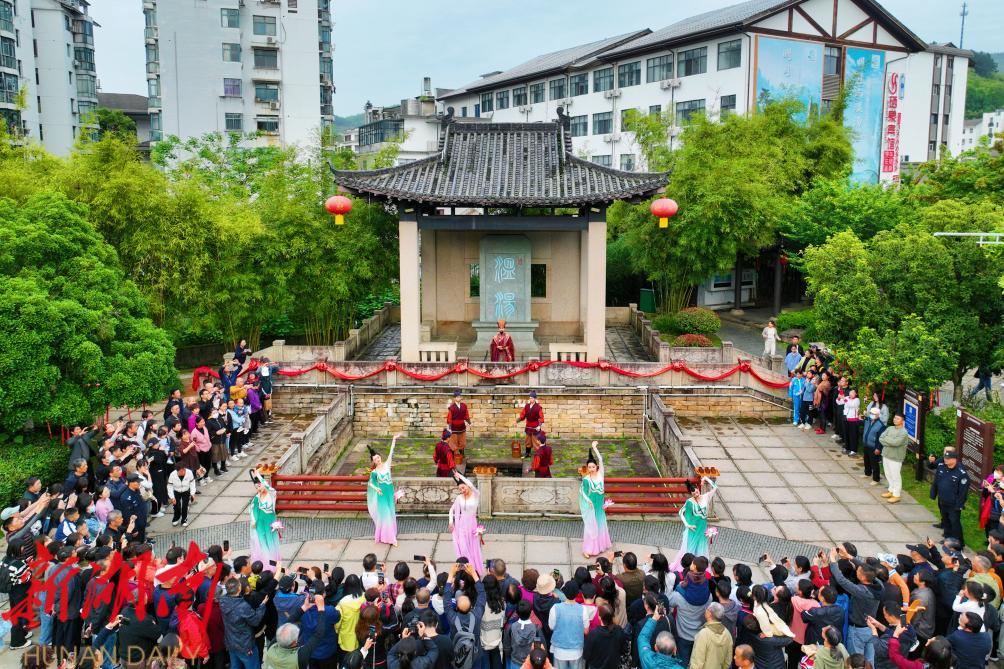 游客在江西宜春温汤镇温汤古井观看表演。(陈旅 摄)