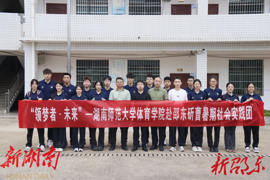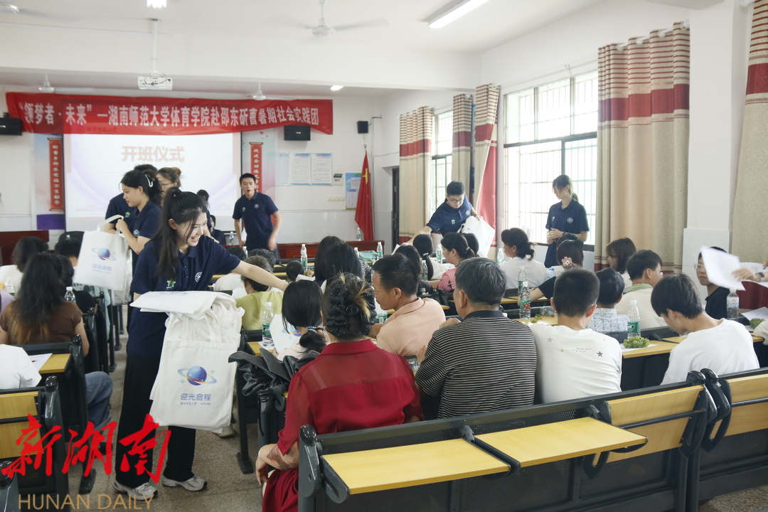 新邵东客户端7月9日讯(记者 张平华 实习 杨欣怡 通讯员 王馨晨 王翼鹏 郭忠鑫) 7月9日上午,湖南师范大学体育学院“领梦者·未来”暑期社会实践团在邵东市斫曹中学举行支教辅导班开班仪式,邀请家长和学生一起了解实践课程内容,促进支教老师与学生交流,积极了解学生对天赋测评、生命安全体适能等课程的想法。