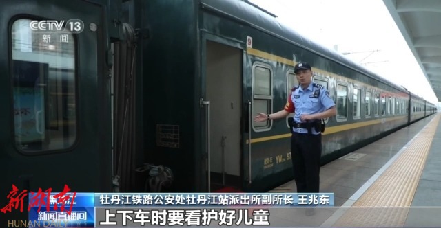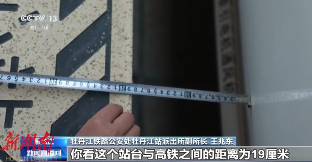 牡丹江铁路公安处牡丹江站派出所副所长 王兆东: 车体与站台之间是存在一定缝隙的,最大可达20多厘米 ,这个站台与高铁之间的距离为19厘米 ,普速列车和站台之间的距离是23厘米 。这个距离对于小朋友来讲是较为宽松且危险的,稍有不慎便会从缝隙中掉下去。铁路部门与我们铁路公安机关在站台上24小时不间断地进行安全宣讲及音频提示,但是仍有些家长没有注意。