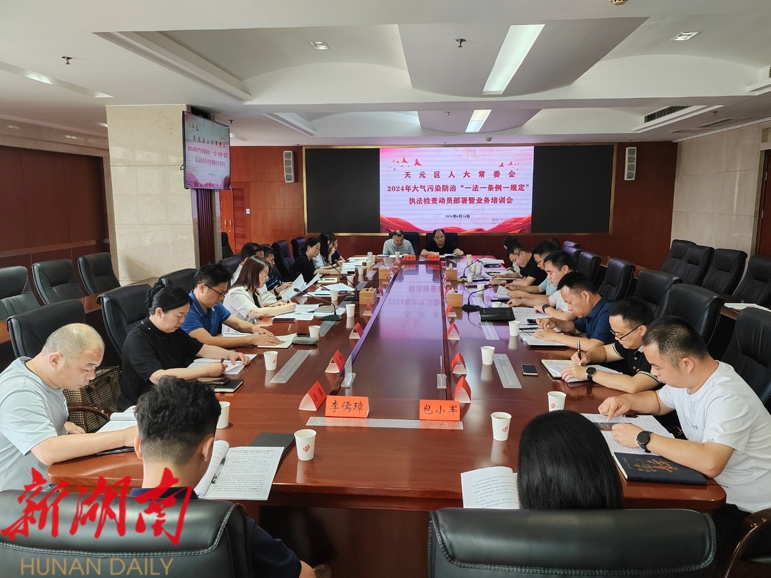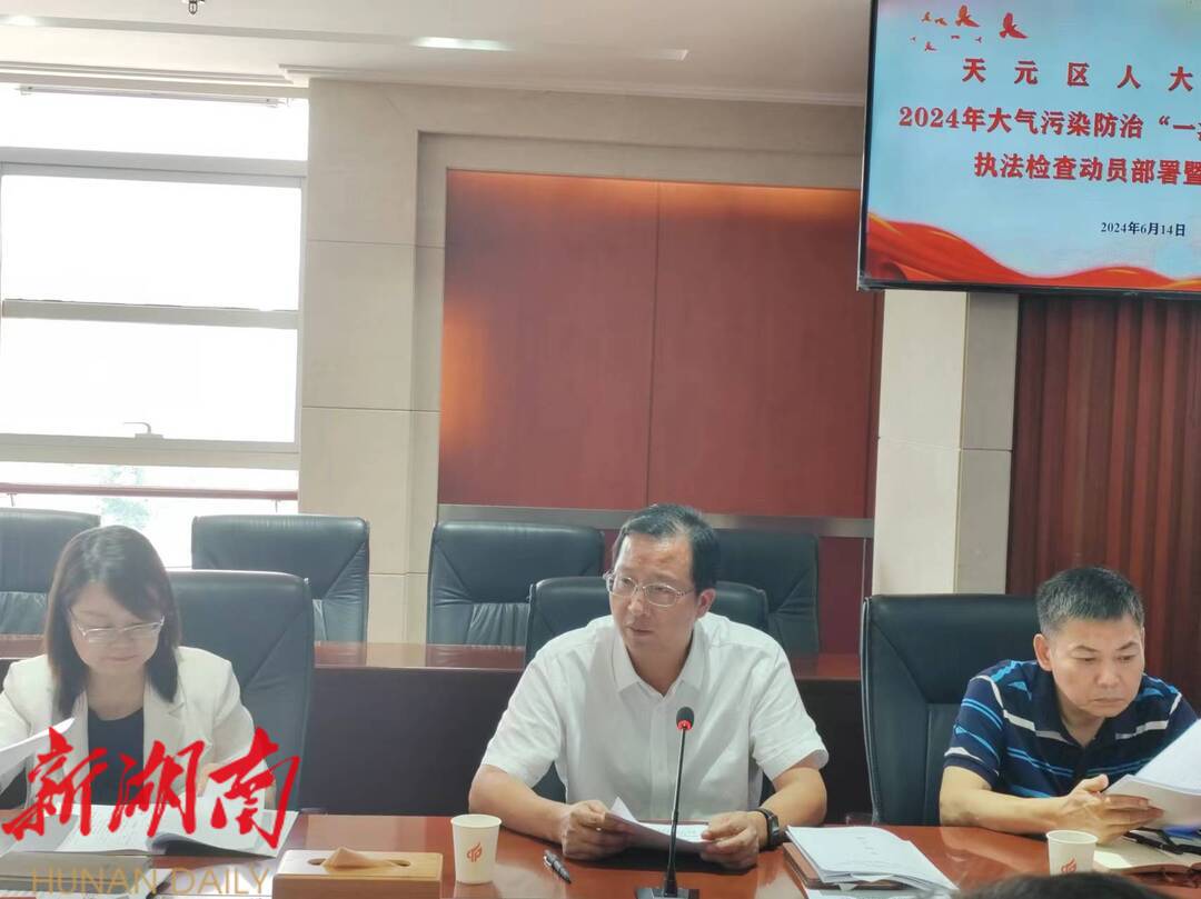 6月 14 日上午,天元区人大 常委会 召开 大气污染防治 “ 一法一条例一规定 ”执法检查动员会议,部署执法检查有关工作。区人大常委会党组书记、主任周琪 出席会议并 动员讲话,副主任刘根平、王维疆参会,区人民政府副区长 陈韬 作表态发言。