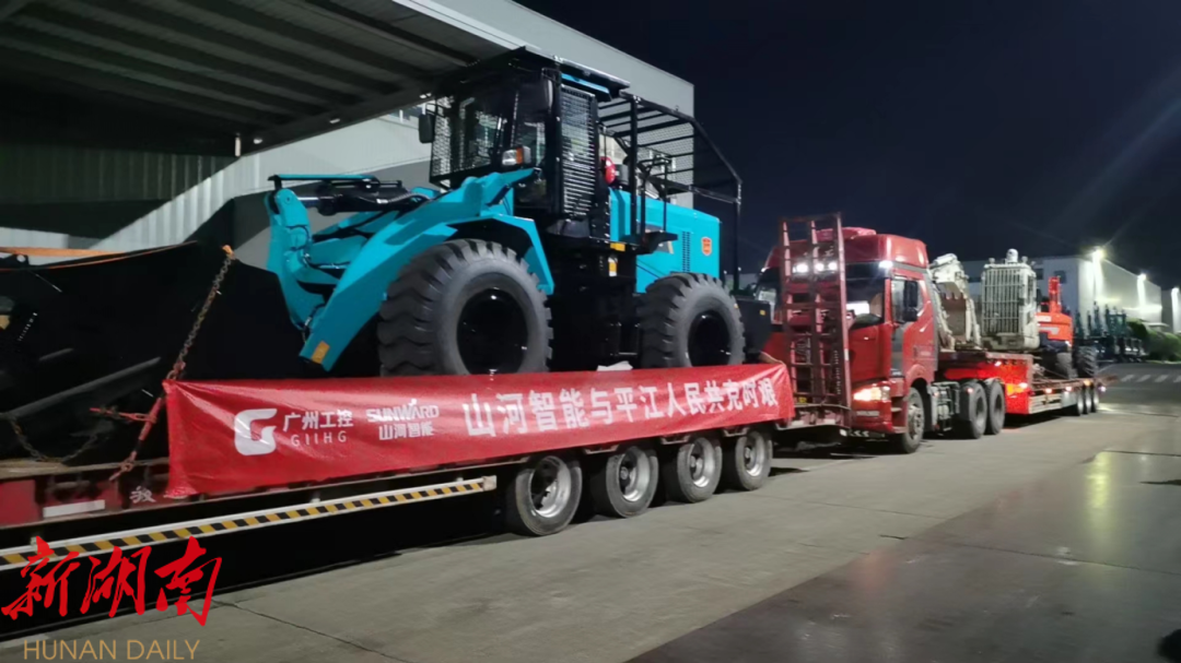 7月4日,湖南省工程机械应急救援队山河智能队紧急筹措装备物资,迅速抽调成立应急救援党员突击队,立即携遥控装载机、遥控挖掘机、复杂地形应急救援机器人、滑移装载机等7台设备,前往平江县进行排涝清淤任务。