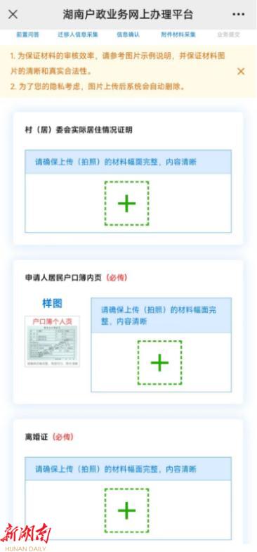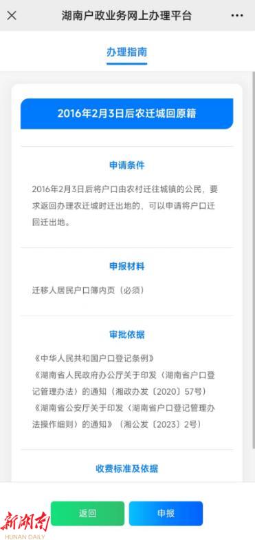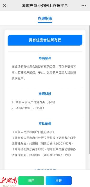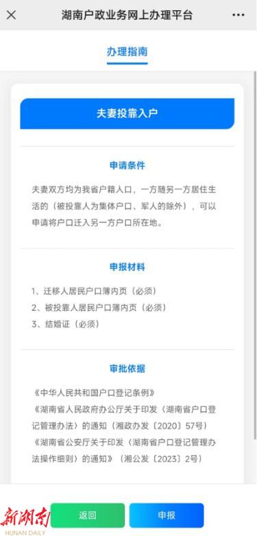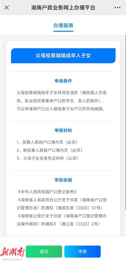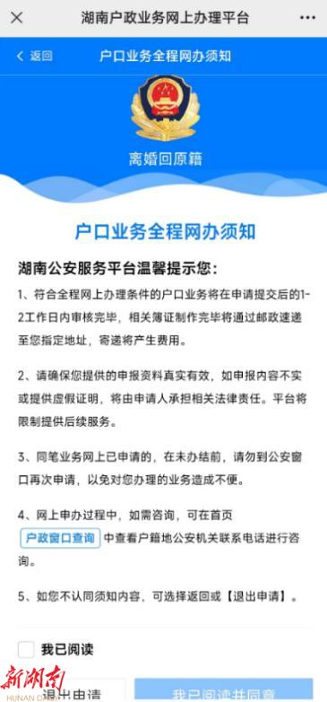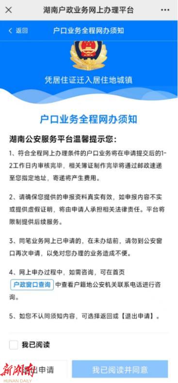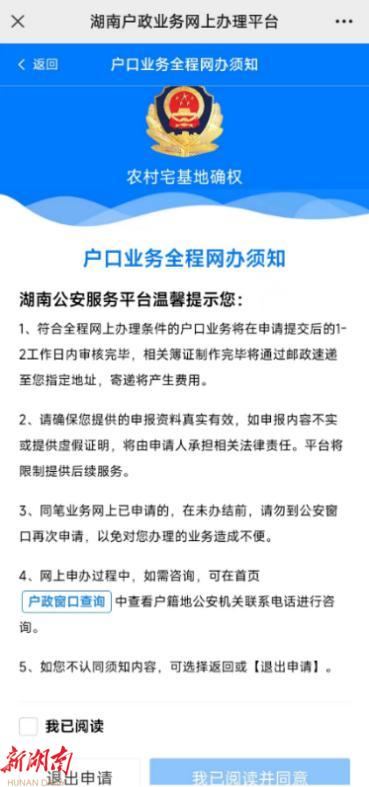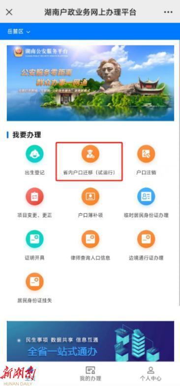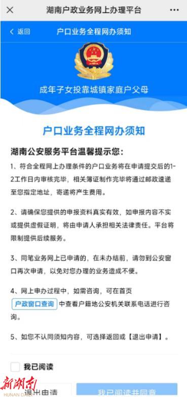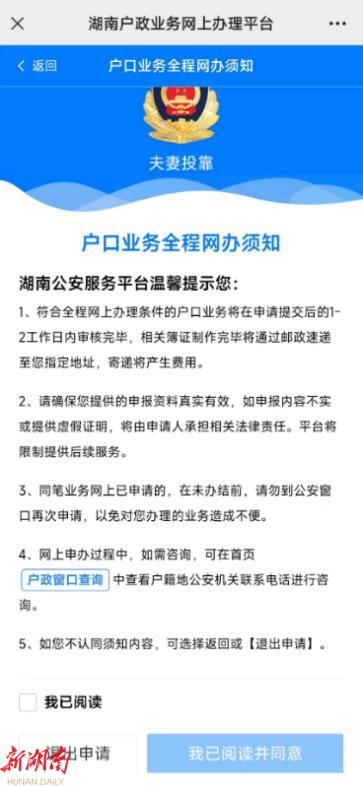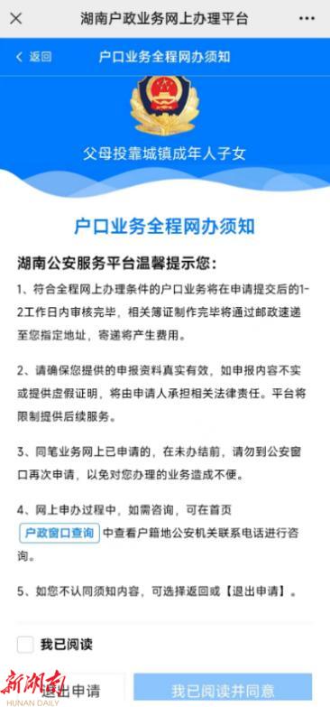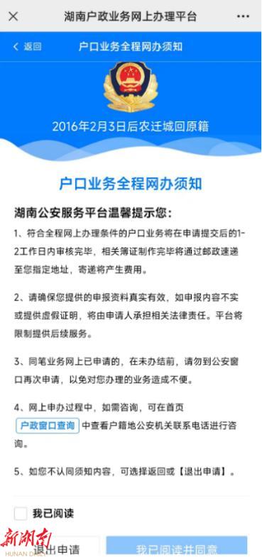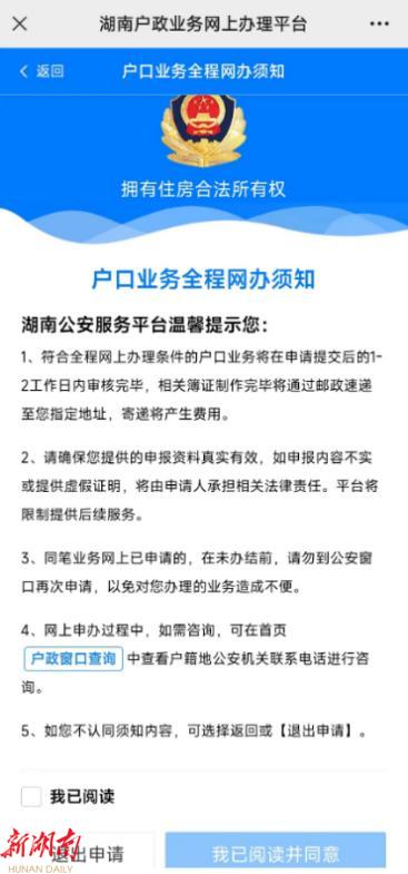 一、湖南户籍居民可微信关注“湖南公安服务平台”公众号,注册并实人认证登录,点击“微警务”,进入平台首页,在热点应用栏中选择“户口业务全程网办”,进入湖南户政业务网上办理平台,在“我要办理”菜单中选择你要申办的业务类型,阅读网办须知,填写相关信息,拍照上传证明材料,提交办件申请。