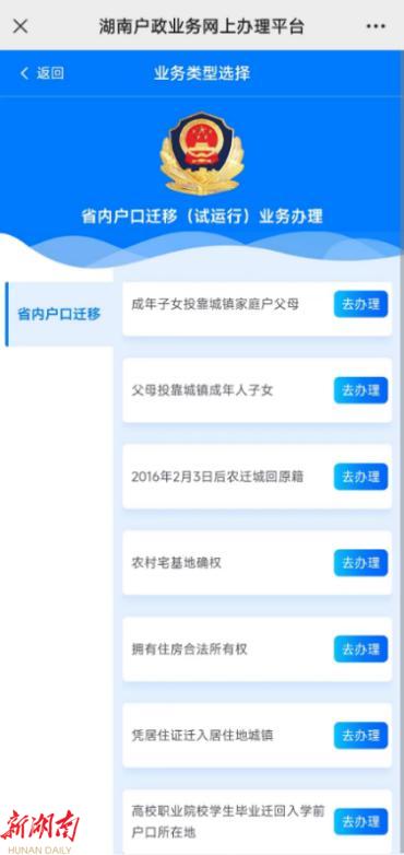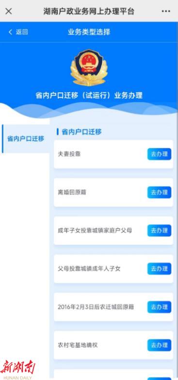 为满足人民群众对户政业务办理的新期待新要求,真正让群众办理高频户政业务“一次也不跑”,我省公安机关从2024年7月10日起,新增开通9项省内户口迁移全流程网上办理服务事项:夫妻投靠户口迁入、离婚回原籍户口迁入、成年子女投靠城镇家庭户父母户口迁入、父母投靠城镇成年子女户口迁入、2016年2月3日后农迁城人员回原籍户口迁入、农村宅基地确权户口迁入、拥有住房合法所有权户口迁入、凭居住证迁入居住地城镇、高校职业院校学生毕业迁回入学前户口所在地。