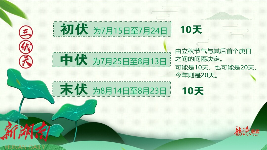 三伏天,出现在小暑与处暑之间,是一年中气温最高且又潮湿、闷热的时段。三伏有初伏、中伏和末伏之分,它的日期是由二十四节气和干支纪日的日期相配合来决定的。天干有10个,分别是甲、乙、丙、丁、戊、己、庚、辛、壬、癸,因此每隔10天就出现一个庚日。每年夏至后的第三个庚日入伏,立秋后的第二个庚日出伏。庚日变化不定,所以每年入伏的日期也不尽相同。初伏和末伏的时长是固定的,均为10天。中伏时长由立秋节气与其后首个庚日之间的间隔决定,可能是10天,也可能是20天,今年则是20天。