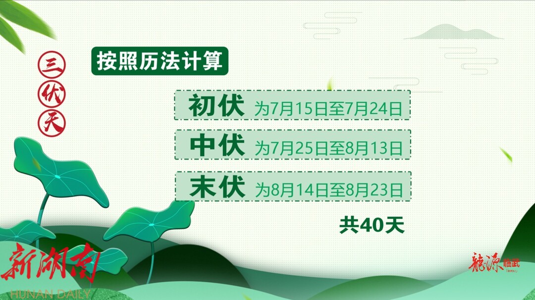 按照历法计算,今年初伏为7月15日至7月24日,中伏为7月25日至8月13日,末伏为8月14日至8月23日,共40天。