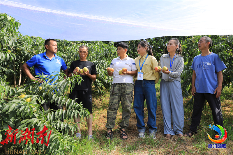 7月17日,麻阳政府购买农业技术服务中心多名工作人员来到兰里镇塘里村李东黄桃园,仔细查看防虫网起到的效果与黄桃当前的长势。