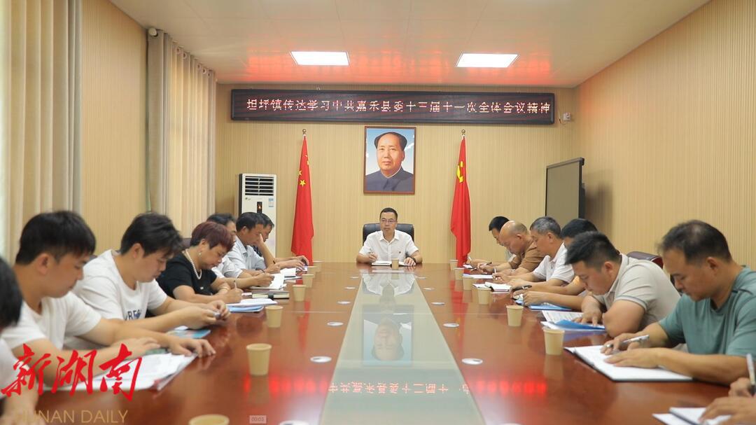 在坦坪镇会议室里,坦坪镇党委书记雷衍雄组织村干部围在一起学习县委十三届十一次全会报告,报告中提出要扎实推进乡村全面振兴,扛牢粮食安全政治责任,巩固和拓展脱贫攻坚成果。2021年,坦坪镇玉洞村成立了嘉禾县宏盛中药种植专业合作社,在天气影响较大的年份里,依然获得了好收成,这次报告中再次提到大力发展特色优质农业建设体系,让他们继续发展合作社的信心倍增。