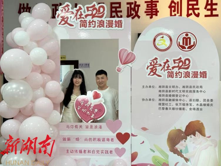 丧事简办,婚事新办。今年5月,湘阴县开展“爱在520,简约浪漫婚”文明实践活动,吸引100余人参与,现场设置拍照打卡区,设置互动环节,发放移风易俗宣传册300份,签订《婚事新办喜事简办承诺书》100份。