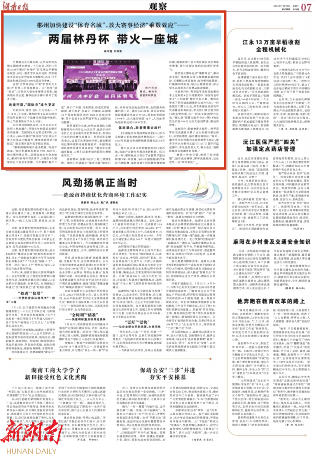 巴黎奥运会开幕在即,全民体育的热情在湘南率先燃起。7月21日,历时4天的2024年郴州“林丹杯”羽毛球公开赛精彩收官,林丹、谢杏芳以及孙完虎、李东根等多位羽坛世界冠军齐聚郴州,还有12个国家和地区的近1500名运动员参赛。