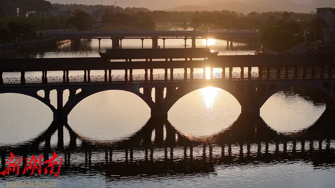 新江永客户端讯(记者 毛文涛 ) 7月22日傍晚,江永持续晴热高温天气“烧”出了“醉”美晚霞 。永明河在夕阳的映照下波光粼粼,河畔景观带的 风雨桥、五一桥等在霞光中如梦如幻,远处的山峦与晚霞融为一体,变得柔和而神秘。县城的轮廓在晚霞的映衬下愈发清晰,营造了浓厚浪漫氛围,月亮还与彩云“同框”构成了一幅宁静、祥和的醉人画卷,让人心情愉悦,陶醉其中,心生向往。