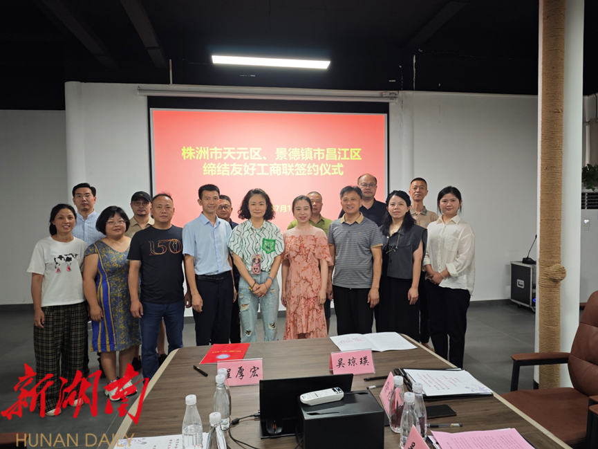 考察组一行与昌江区工商联进行座谈交流,座谈会上,双方相互介绍了株洲高新区(天元区)、昌江区的区情区况以及工商联工作的开展情况,并围绕两地的产业资源。营商环境以及充分发挥工商联作用,促进民营企业发展等方面内容进行了深入交流。随后,双方签订友好工商联协议,并表示将以此次为契机,进一步加强两地商会及会员企业间的交流互动,推动两地企业多层次、多领域的合作发展。考察期间,参观江西乾富半导体有限公司、 “御瓷馆”和景德镇外销瓷博物馆,共同学习中国传统陶瓷文化以及景德镇外销瓷历史文化故事。