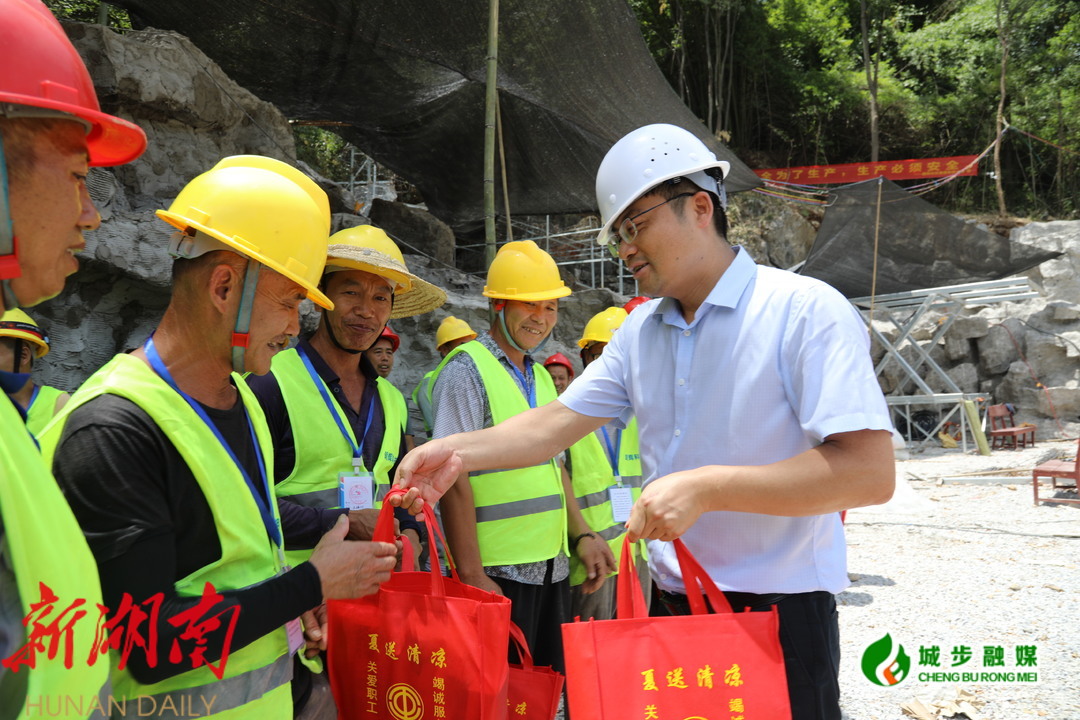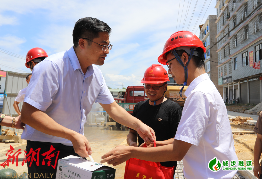 图为县委书记余勋伟在南山大道提质改造项目施工现场为施工人员送上防暑降温物品