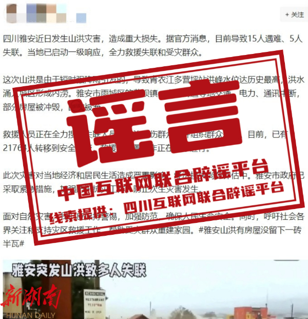 7月21日,有网民在社交平台发布图文称,雅安市雨城区的草坝镇、大兴街道等地发生山洪灾害,当地交通、电力、通讯中断,部分房屋被冲毁,田地被淹,并致多人失联。经核实,两地并未出现帖文所述情况,图片中的地点也并非雨城区草坝镇、大兴街道辖区。(来源:四川互联网举报辟谣平台)