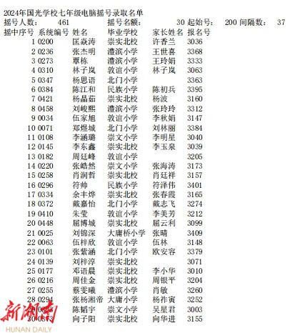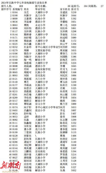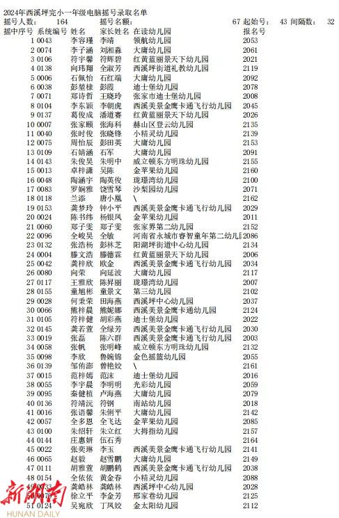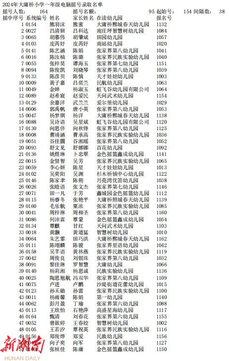 据了解,今年永定中心城区共有大庸桥小学、西溪坪完小2所小学,国光实验学校、市民中、澧兰中学3所初中参加电脑派位。通过摇号,大庸桥小学录取95人,西溪坪完小录取67人,国光学校录取30人,市民中录取60人,澧兰中学录取61人。本次参加派位没有被录取的学生,将由区教育局统筹安排到城区其他有空余学位的学校就读。