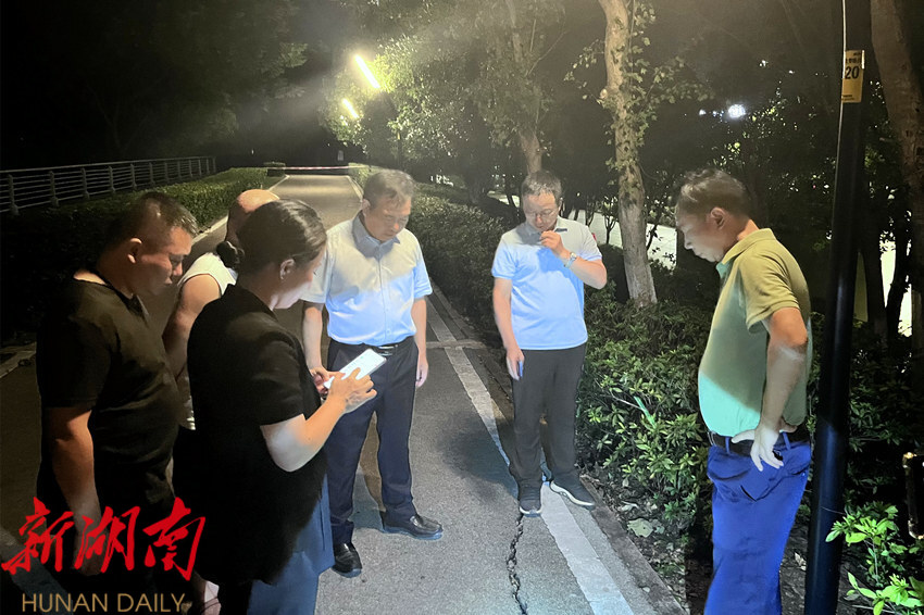 在雨湖区法治公园附近查看内涝处理情况。