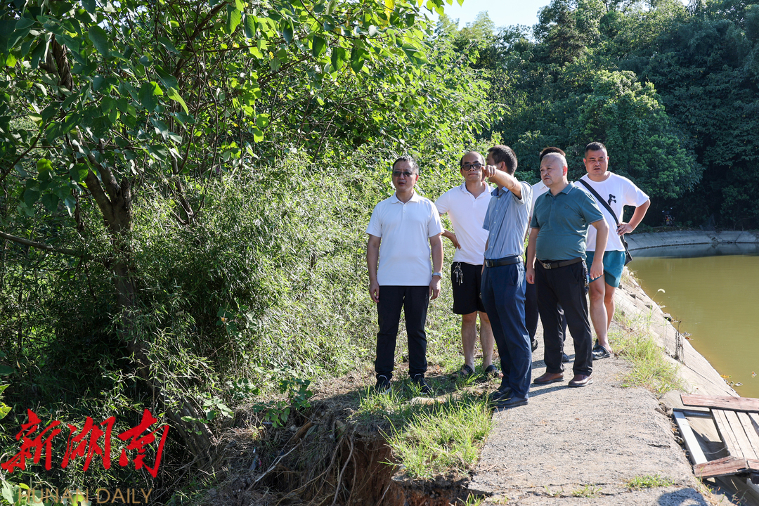 柳军辉实地查看鹤岭镇响塘村水塘受损情况。
