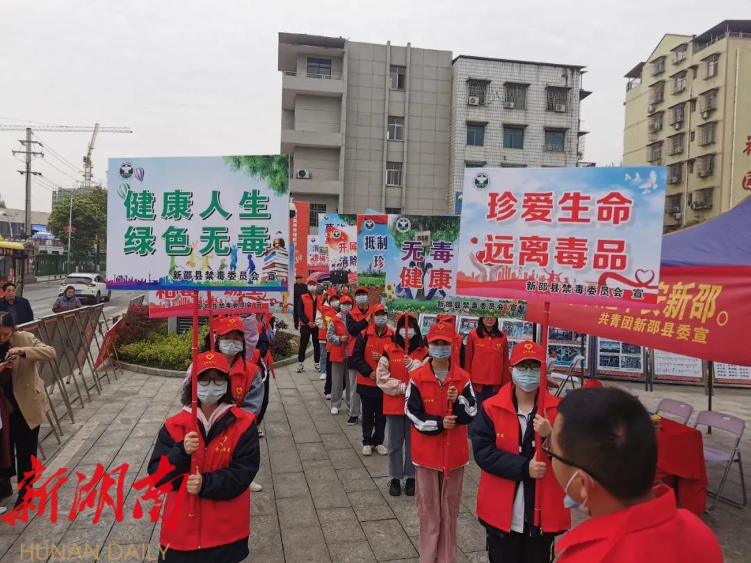 新新邵客户端3月25日讯 (通讯员 陈 莉)为进一步增强群众识毒、拒毒、防毒意识,3月23日,团县委组织开展“手牵手,同筑无毒家园;心连心,共建平安新邵”志愿服务活动,来自团县委、新邵一中、县禁毒协会、县青年志愿者协会、县农村致富带头人协会的58名青年志愿者手举宣传牌沿街宣传禁毒知识,为群众发放禁毒宣传资料。