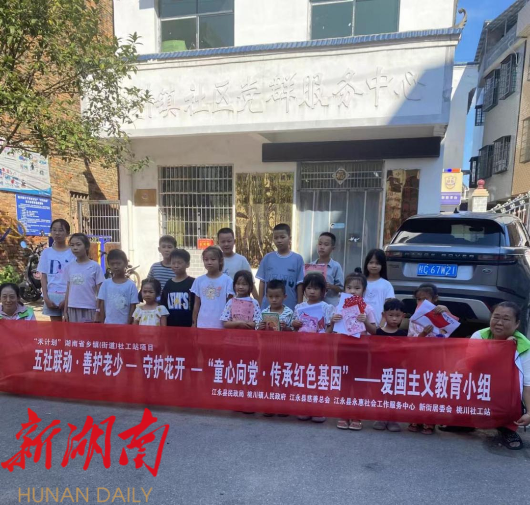 新江永客户端讯(通讯员 杨惠菲 ) 在“八一”建军节来临之际,江永县民政局社工站、县交警二中队来到桃川镇,联合隆兴街、新街、四香、书馆四个居民委员会,开展了以“童心向党·传承红色基因”为主题的爱国主义教育活动,缅怀革命先烈丰功伟绩,厚植爱国主义情怀。