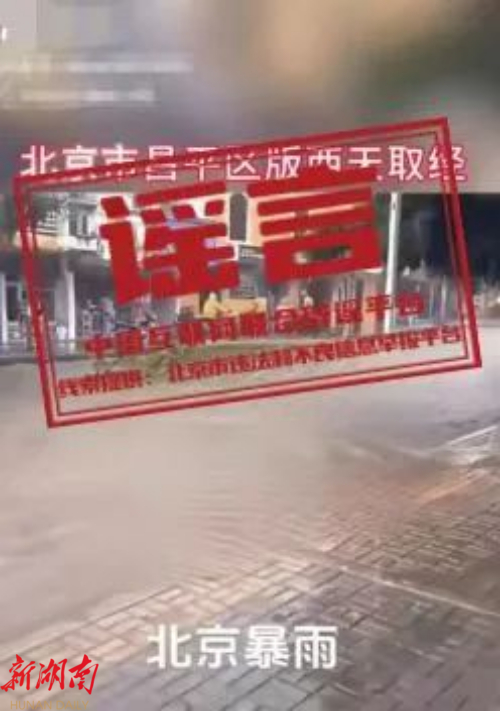 真相: 近日,有自媒体账号发布标题为《北京市昌平区版西天取经》的视频,内容为两名男子脚踩树干顺流而下。经核实,该视频为广东东莞某街道积水视频,被移花接木编造谣言称事发于北京市昌平区。(来源:“北京网络举报”微信公众号)