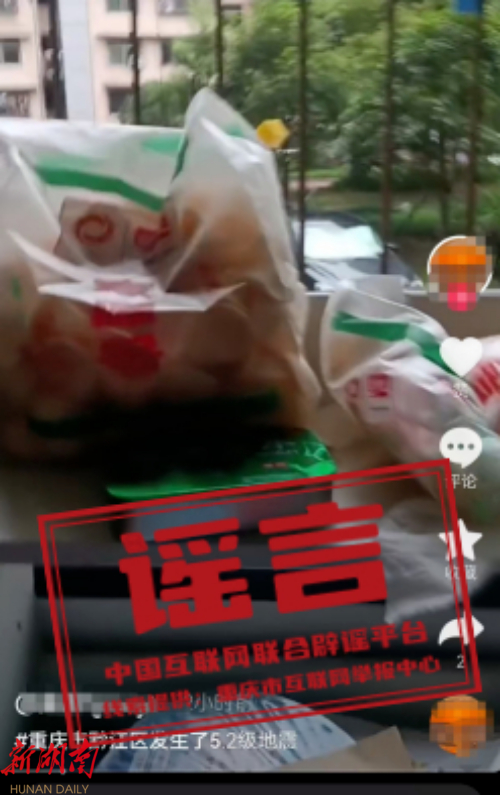 真相: 8月5日,某网民发布视频并配文“重庆市黔江区发生了5.2级地震”,引发关注。经向重庆市地震局、黔江区应急管理局核实,黔江区近期未发生地震,网传信息系谣言。(来源:“重庆辟谣”微信公众号)