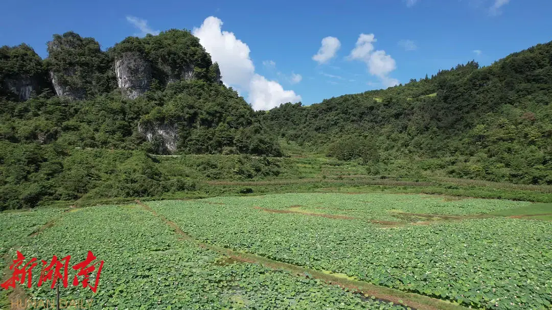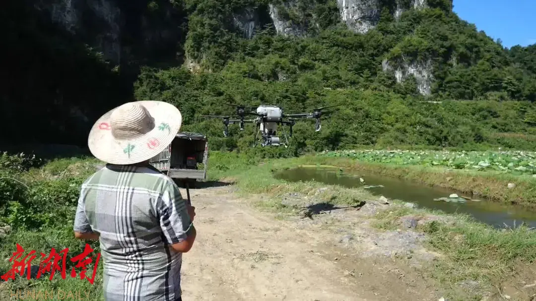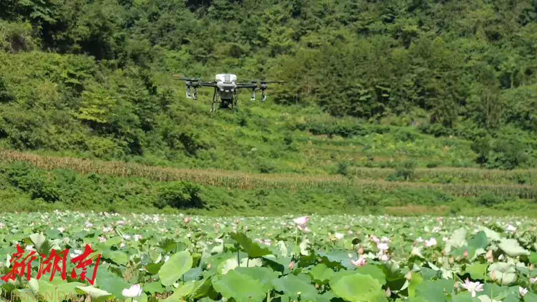 湖南日报·新湖南客户端8月6日讯(记者 钟彬豪)8月5日,在八大公山镇筲箕池村,祥康中药材种植专业合作社利用植保无人机飞防作业,精准喷洒肥料,保障230余亩荷花增产增收。