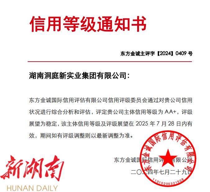 AA+!湖南洞庭新实业集团有限公司获评湖南省非百强县首个AA+信用等级