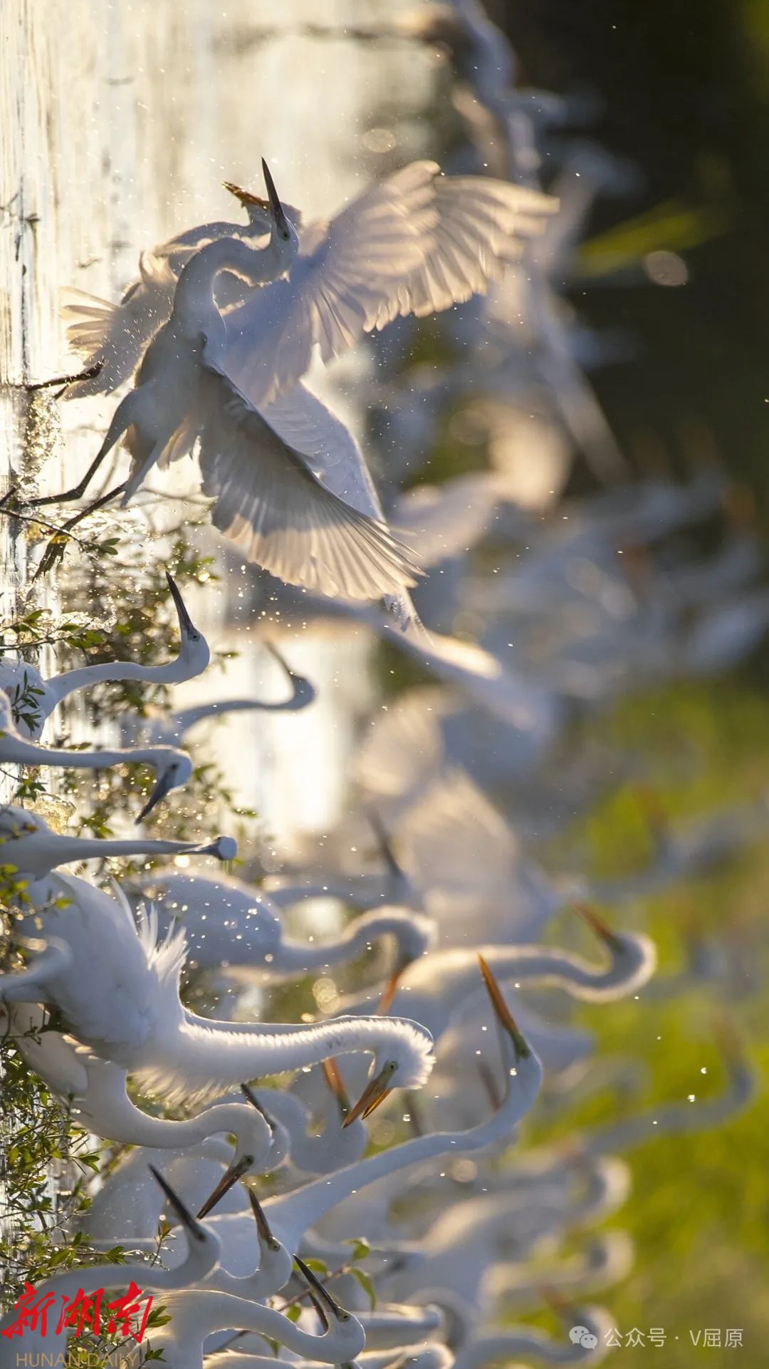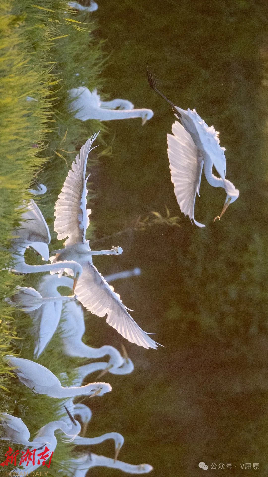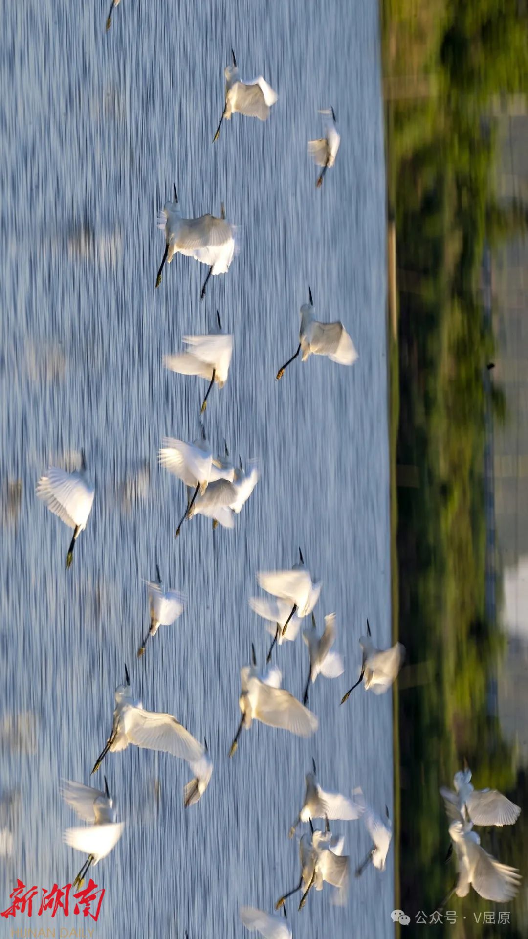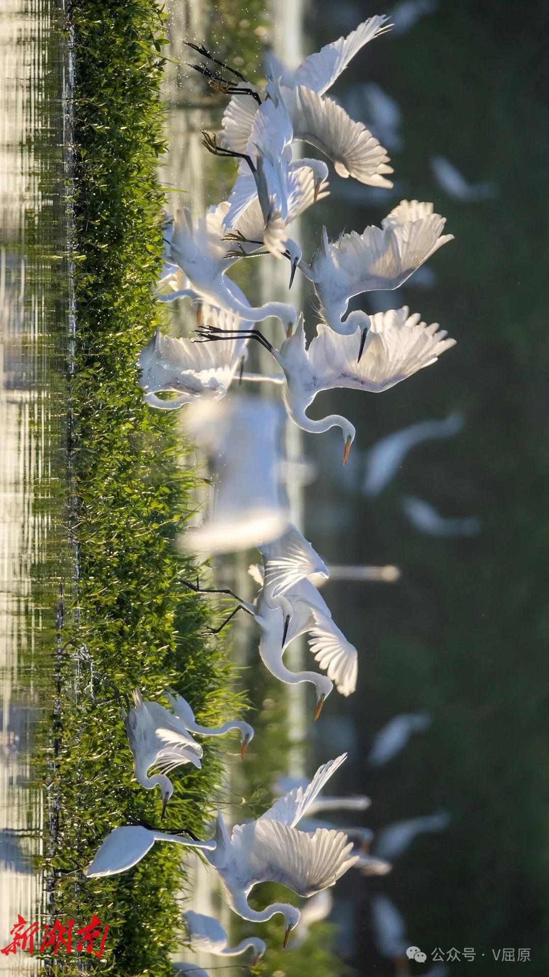 湖南日报·新湖南客户端8月14日讯 (通讯员 魏璐璇 周洋) 太阳从东方地平线升起,阳光将水面的雾气和滩涂的浅草都染成了金色。成群的白鹭趁着清晨的微凉伸长脖子沐浴着阳光,他们身姿傲立,袅袅婷婷,时而低飞过水面,时而静静伫立,时而振翅高飞,时而在河中捕食嬉戏。“白鹭行时散飞去,又如雪点青山云”诗句里的美好画面,就出现在这舒适的初秋清晨,惊艳演绎着屈原管理区的“岁月静好”。
