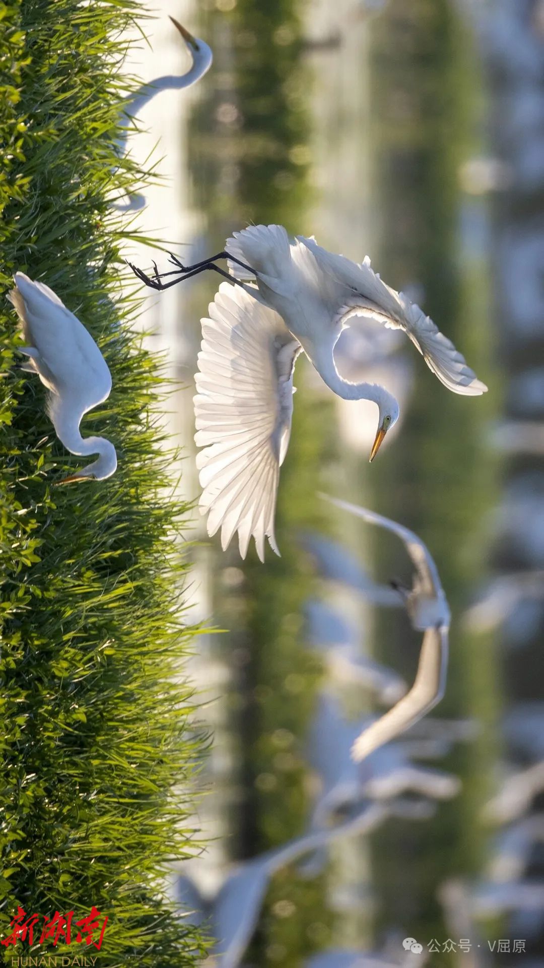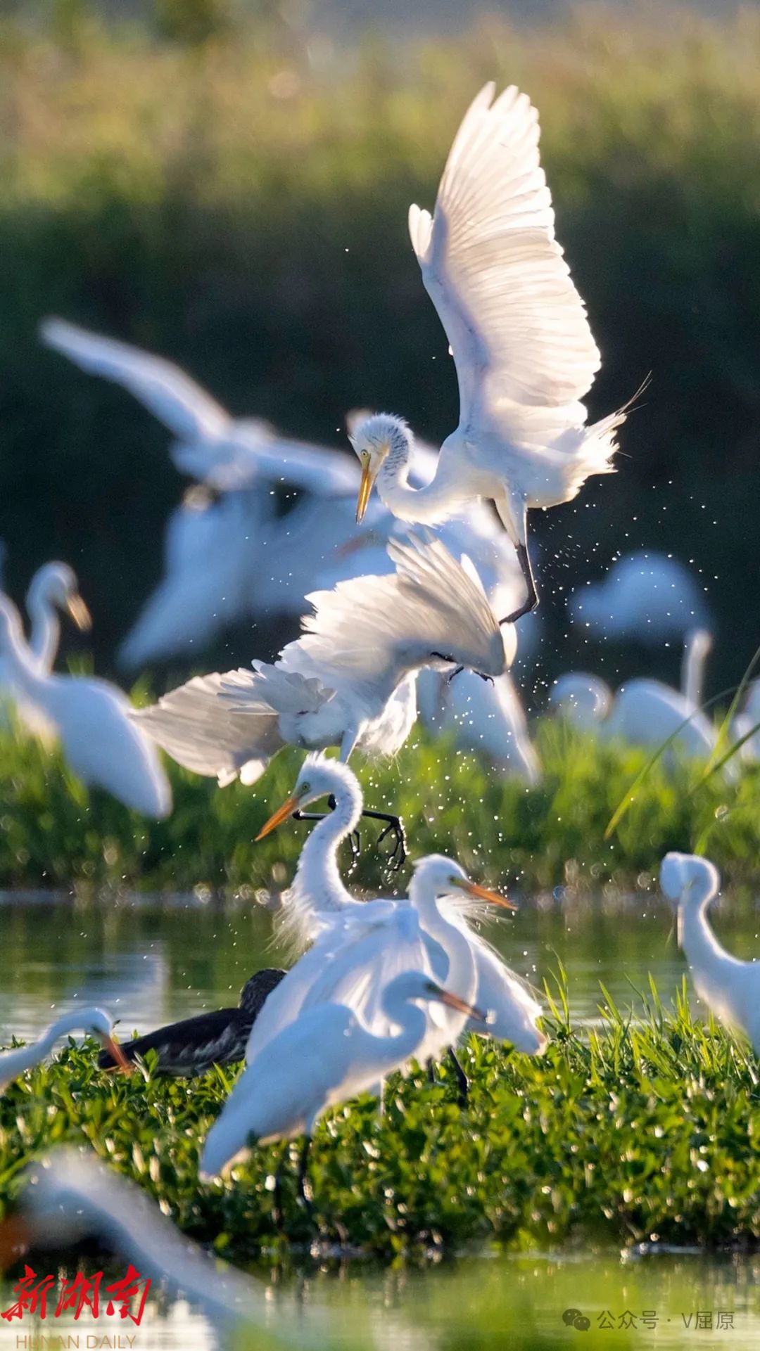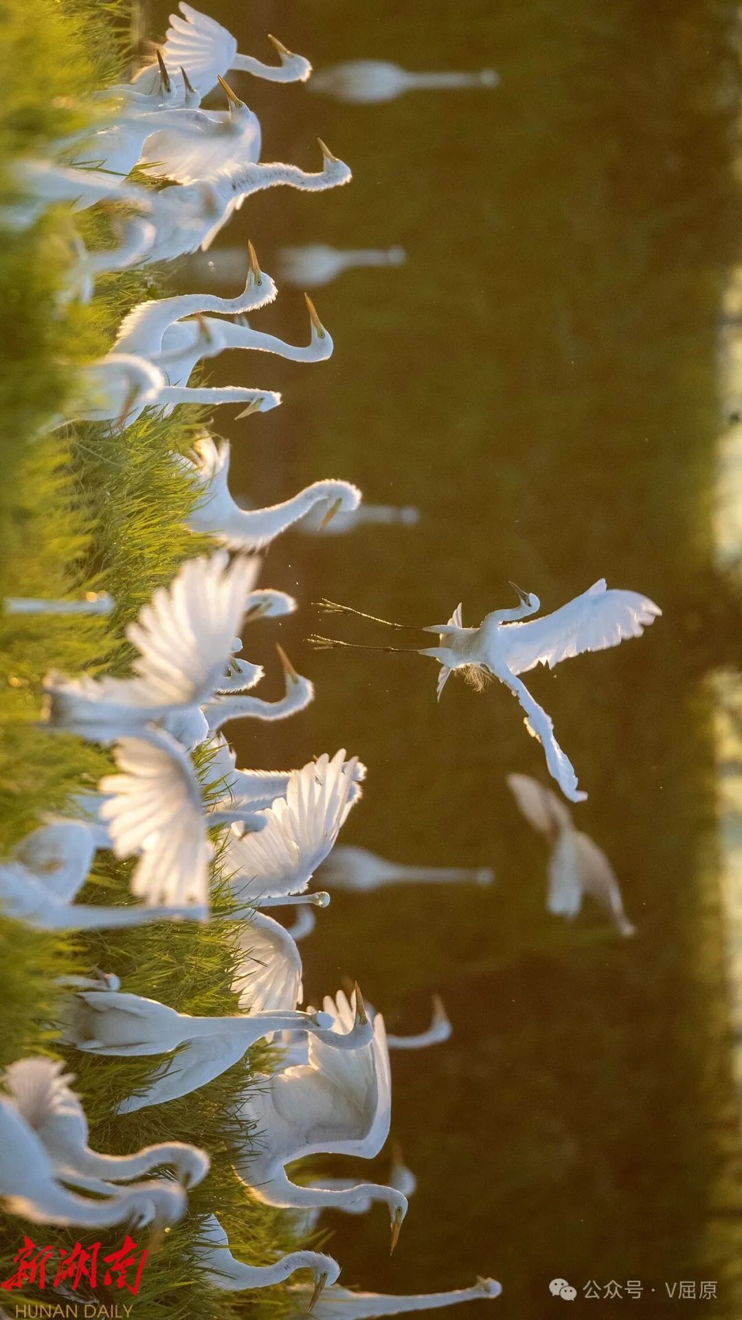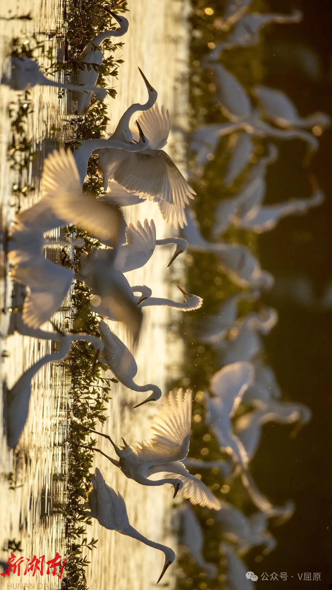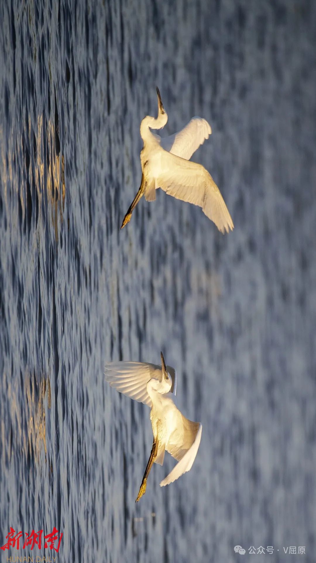 湖南日报·新湖南客户端8月14日讯 (通讯员 魏璐璇 周洋) 太阳从东方地平线升起,阳光将水面的雾气和滩涂的浅草都染成了金色。成群的白鹭趁着清晨的微凉伸长脖子沐浴着阳光,他们身姿傲立,袅袅婷婷,时而低飞过水面,时而静静伫立,时而振翅高飞,时而在河中捕食嬉戏。“白鹭行时散飞去,又如雪点青山云”诗句里的美好画面,就出现在这舒适的初秋清晨,惊艳演绎着屈原管理区的“岁月静好”。