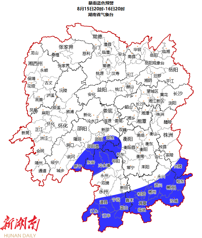 湖南省气象台08月15日16时发布暴雨蓝色预警 :
