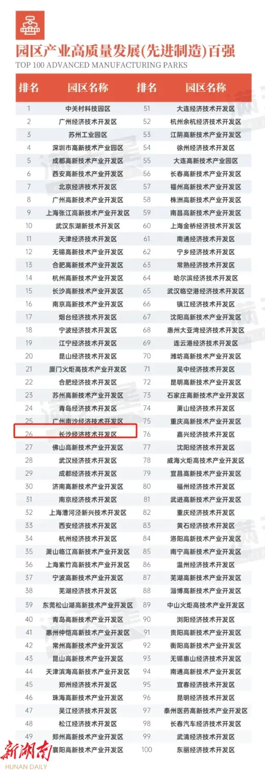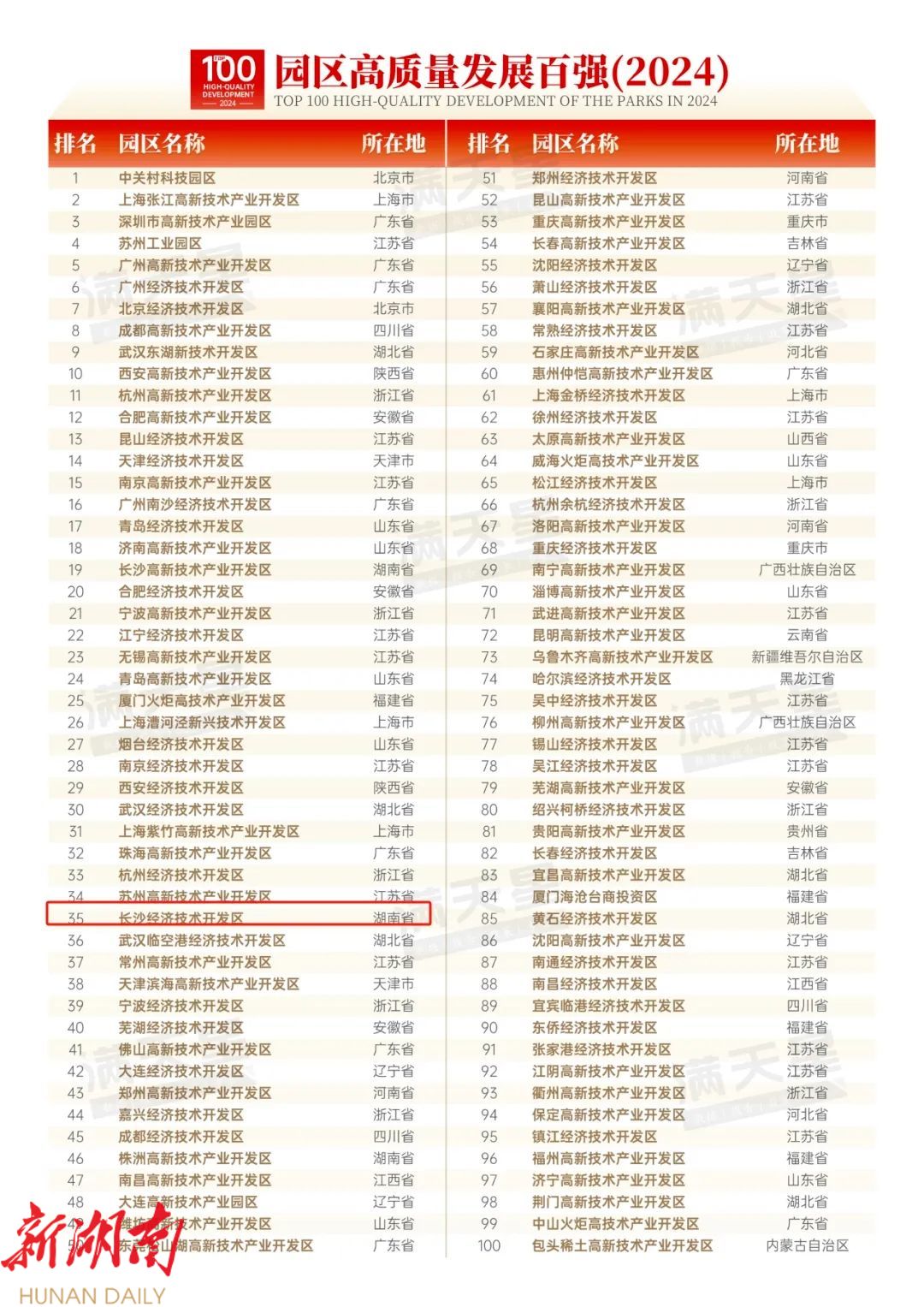 本次发布的《园区高质量发展百强(2024)》榜单中,湖南入选3家,分别是:长沙高新技术产业开发区(第19位)、长沙经济技术开发区(第35位)、株洲高新技术产业开发区(第46位)。