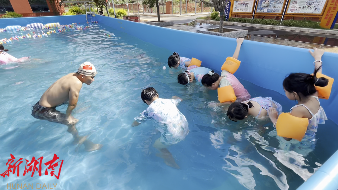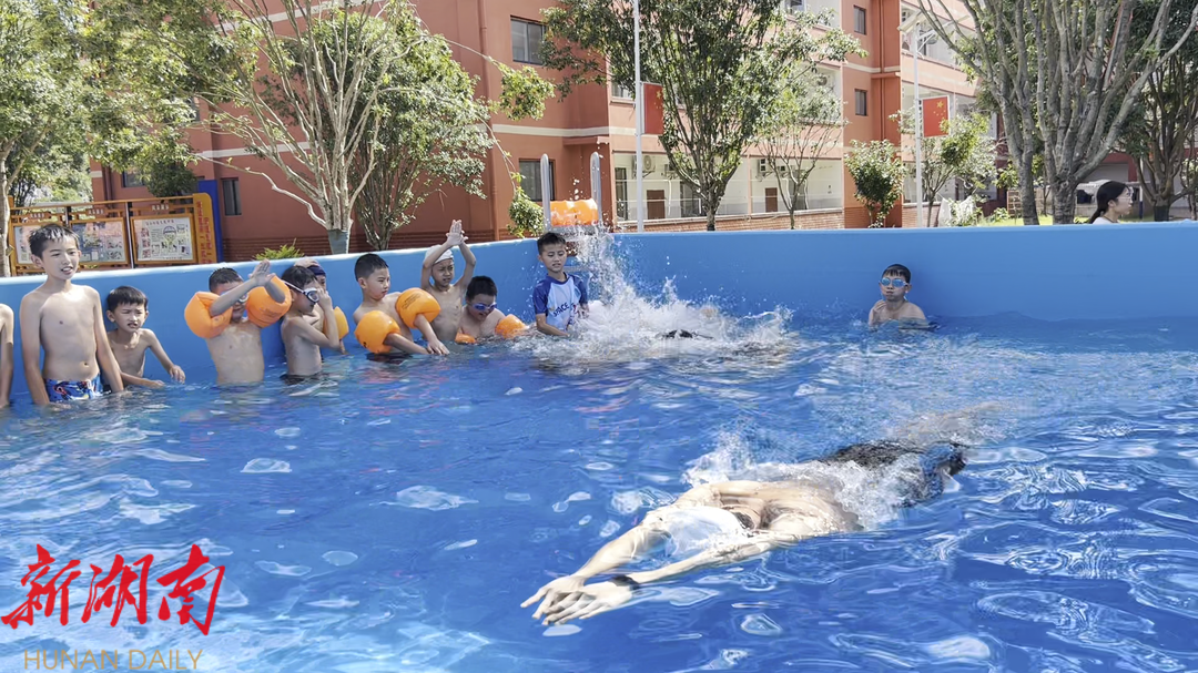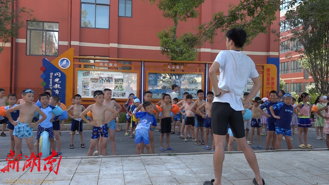 新江永客户端讯(记者 廖光瑜 ) 暑期是学生溺水的高发期,为帮助同学们学会游泳方法,掌握自救技能,近日,江永县金海明礼学校依托校园室外游泳池,开设暑期游泳特色课程,并选派有游泳教练资格的老师担任游泳教练,积极开展游泳项目技能培训课。