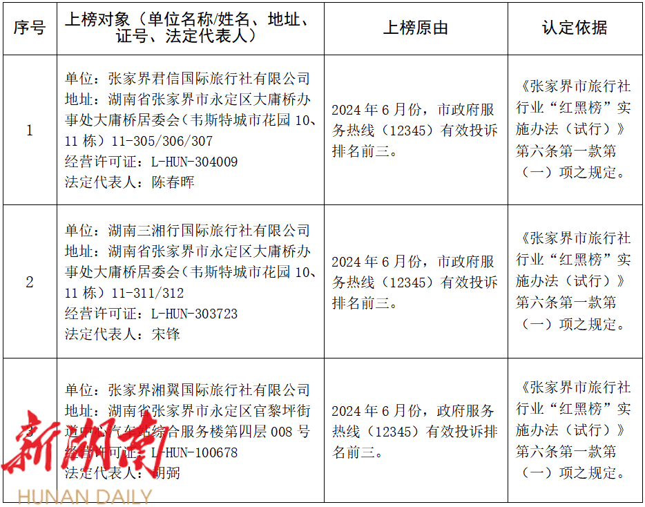 依据《张家界市旅行社行业“红黑榜”实施办法(试行)》(张旅工委办〔2023〕20号)相关规定,以下旅行社被列入“黑榜”名单,现予以实名公告。