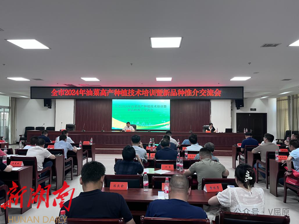 湖南日报·新湖南客户端8月22日讯(通讯员 梁静) 8月20日,岳阳市2024年油菜高产种植技术培训暨新品种推介交流会在屈原管理区举行。市农业农村局副局长陈刚出席会议并讲话,市农业农村事务中心主任陈细兵,市供销社理事会副主任周傲文,屈原管理区党委委员、管委会副主任曹正平进行致辞。各县市区供销系统负责人、农技公司负责人、油菜种植大户等参加会议。