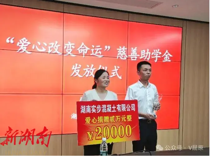 发放仪式上,区民政局主要负责人为湖南实步混凝土有限公司颁发了“爱心企业”荣誉奖杯。随后,受助学生上台领取助学金。